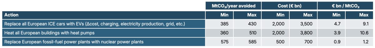The following table shows that, in Europe, replacing fossil-fuel power plants (coal, gas, oil) with nuclear power stations would be far more effective than replacing combustion-engine cars with battery electric vehicles - at a cost per ton of CO2 avoided up to ten times lower: