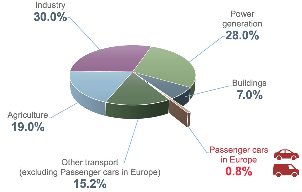 All European cars account for just 0.8% of global greenhouse gas (GHG) emissions. That is very little. As a result, the impact of converting the entire European car fleet to full electric - a process that will take decades - on global warming will be small, and indeed almost invisible: