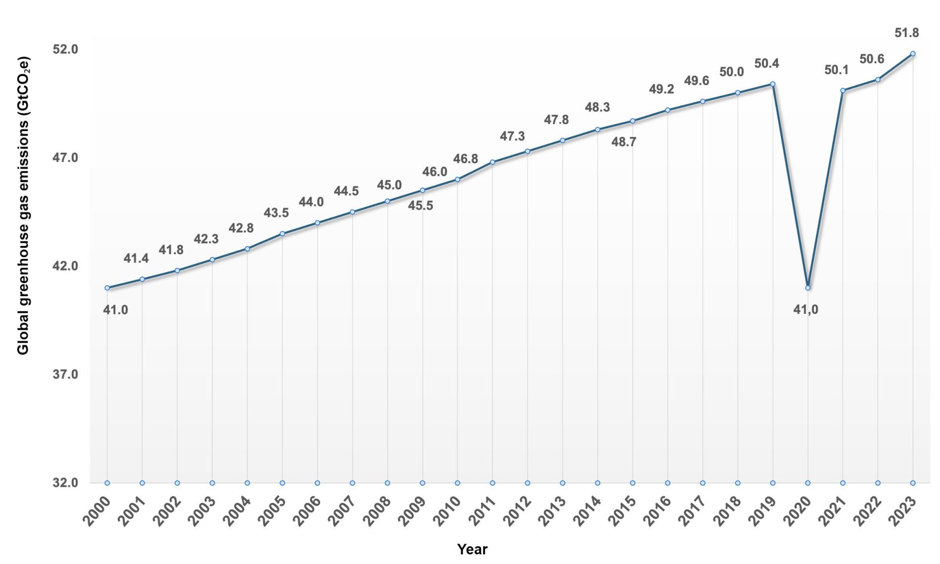 In reality, this 0.56% reduction, achieved only after several decades, is all the more insignificant given that global greenhouse gas emissions have been rising by around 1.1% per year since 2000 and continue to do so. The only year in which global GHG emissions fell was during the COVID crisis, which clearly illustrates that economic activity and emissions go hand in hand: