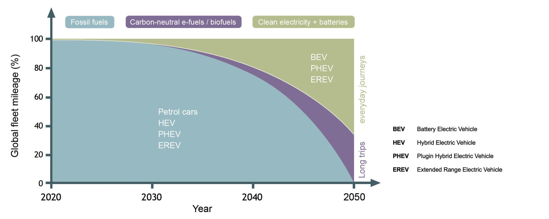 The diagram below schematically illustrates what the path to carbon neutrality by 2050 could look like by combining the strengths of electrochemical batteries with those of e-fuels: