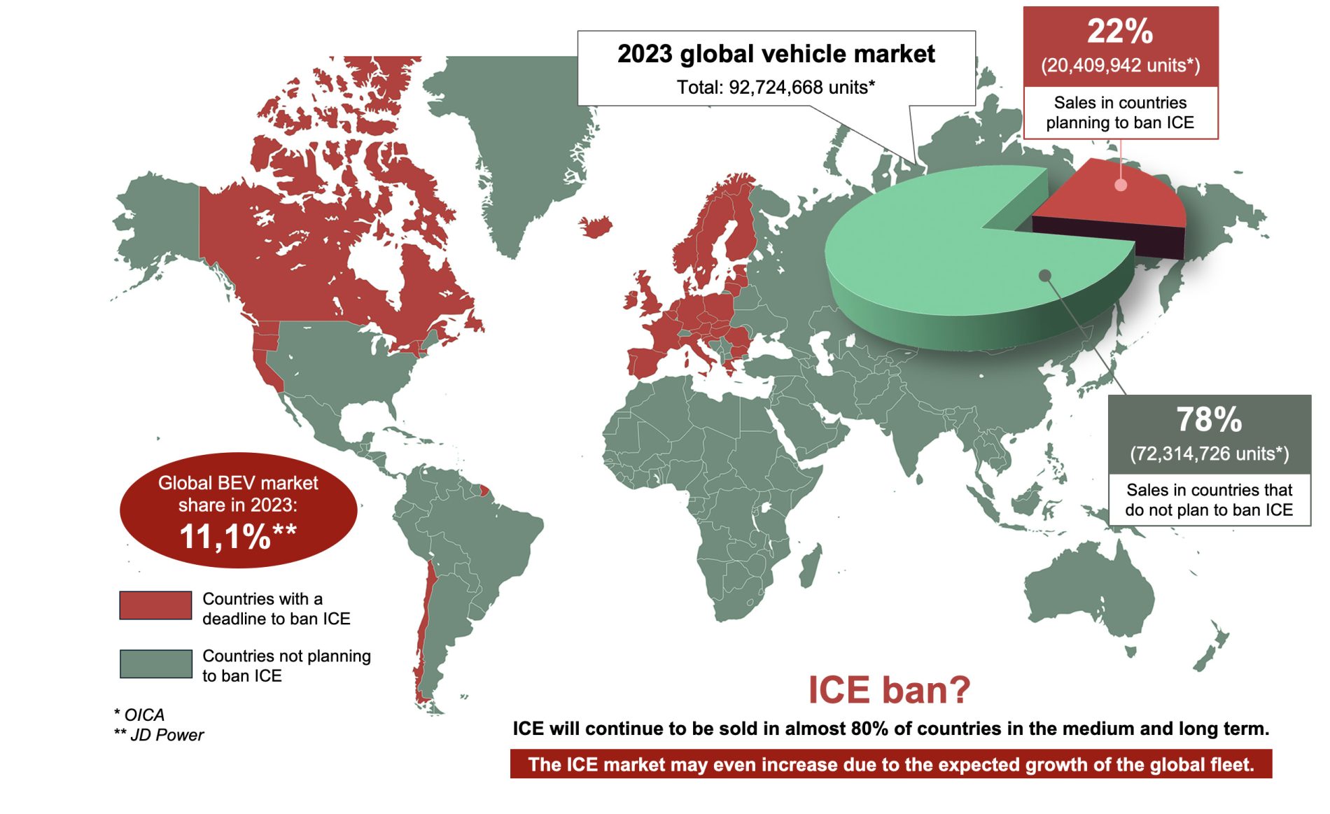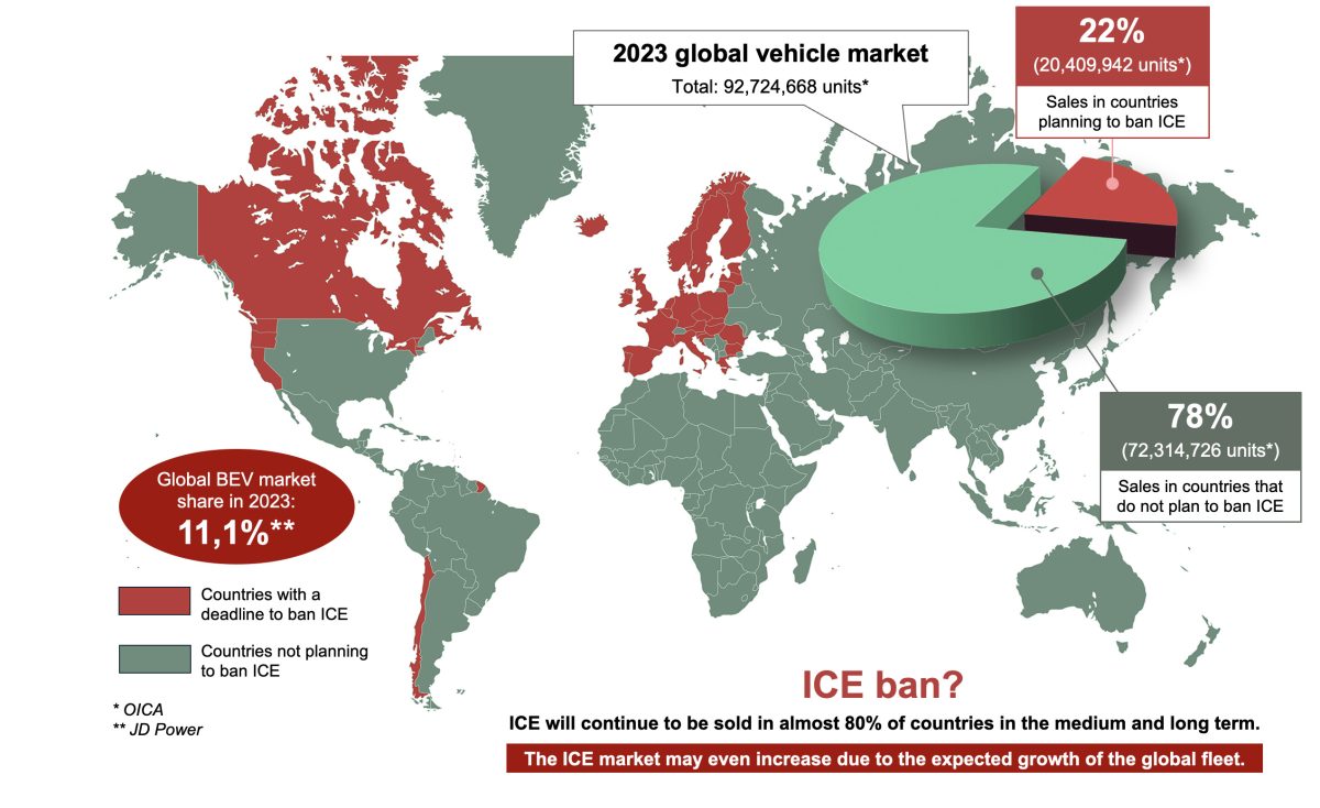 This figure highlights Europe’s singular position: in 2023, 78% of all new vehicles sold worldwide were sold in countries that have not decided to ban the internal combustion engine (ICE):