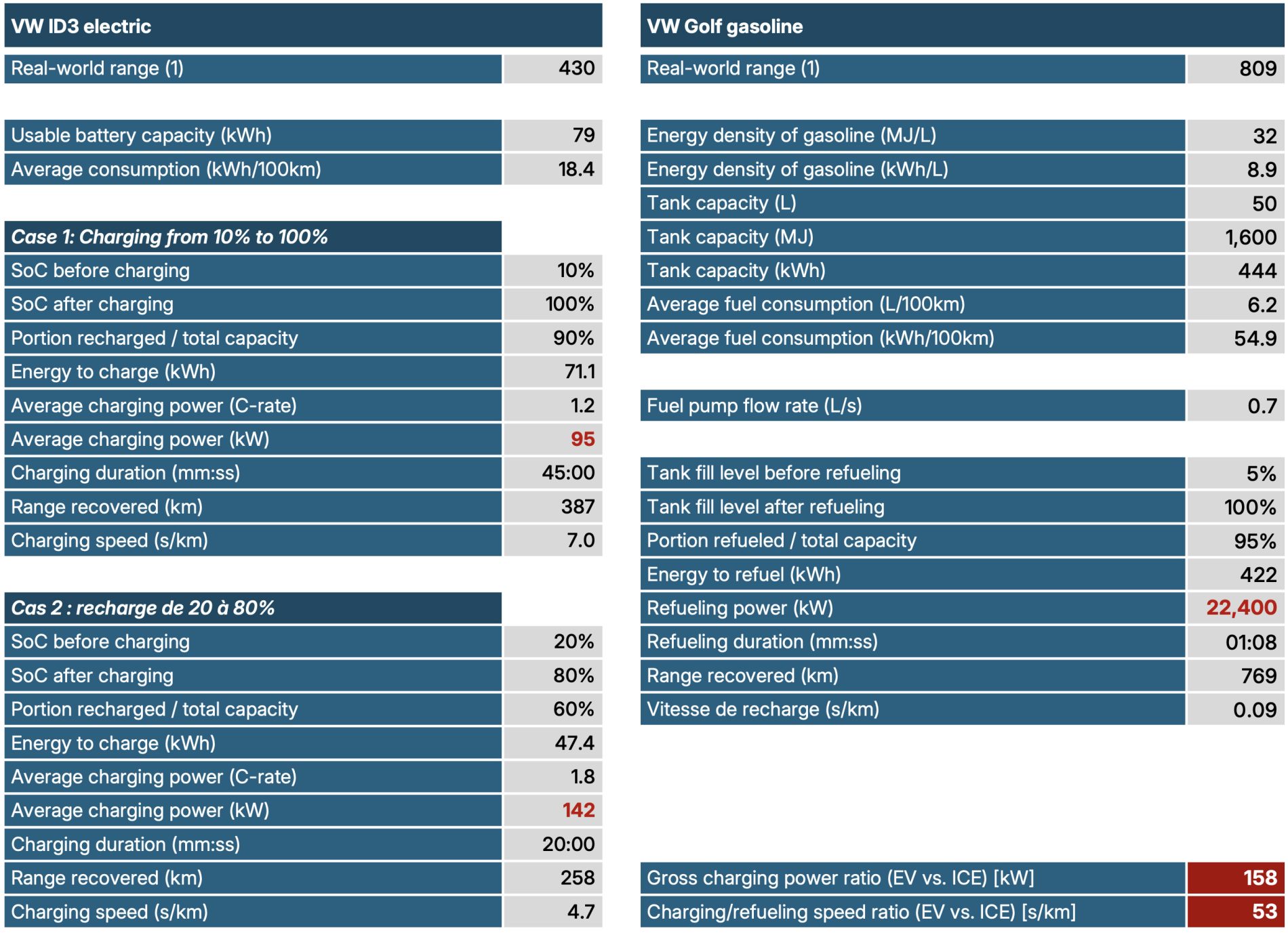 A fuel pump transfers energy into the tank of a gasoline Golf at a minimum power of 22.4 megawatts (0.7 L of gasoline per second × 32 MJ/L). This is 160 times more than the power delivered by a fast-charging station to an electric ID.3 equipped with a 79-kWh lithium-ion battery.