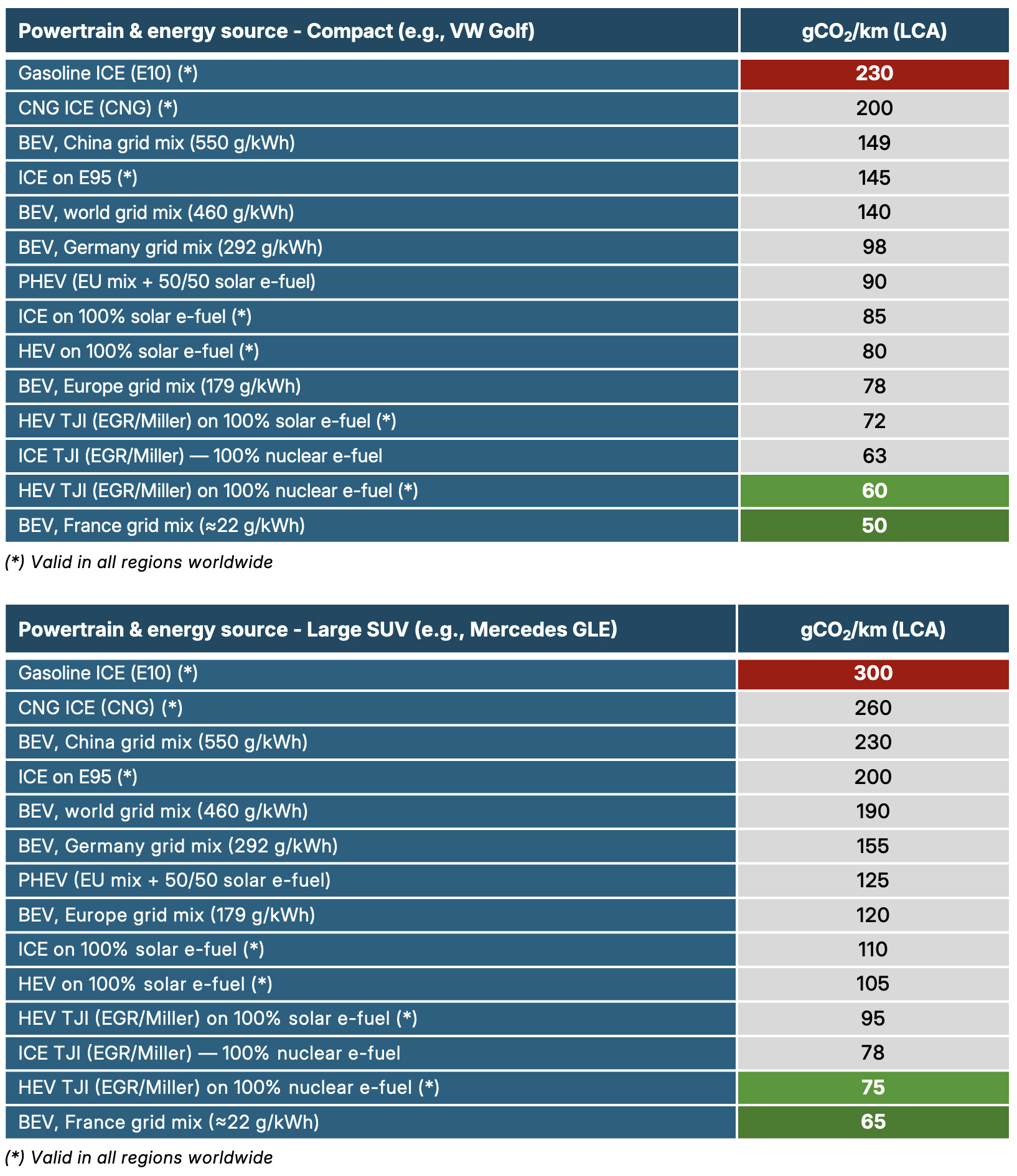 The tables below support the view expressed by Carlos Tavares - former CEO of Stellantis - who stated in 2023: “There were solutions that, from an environmental standpoint, were far more effective, less costly for consumers, less costly for public finances, and these solutions, for reasons that I would describe as dogmatism, were not treated with the necessary objectivity.”